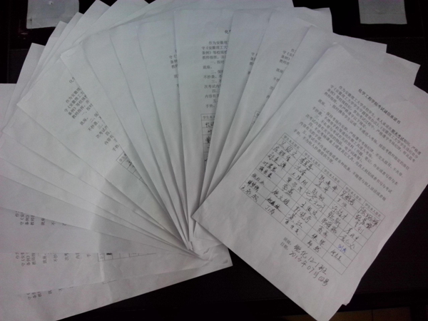 为了响应学校关于“严肃考风考纪,诚实守信做人”的号召,增强同学们诚信考试,诚信做人的意识,教育学生以正确的态度对待考试,在考试过程中培养诚信守纪的品德和作风。化学工程学院自2013年7月2日起,开展了诚信考试承诺签名活动、以班级为单位的主题班会教育活动、以及走进宿舍宣传等一系列活动。