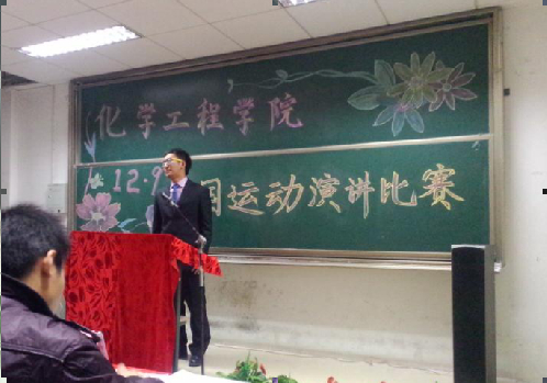 为了纪念“一二·九”抗日救亡运动78周年,弘扬广大学生的爱国主义精神,唤起青年学生的民族意识,2013年12月6日晚,化学工程学院在北校区3305教室举行了以“热爱学习,奋发图强”为主题的演讲比赛。