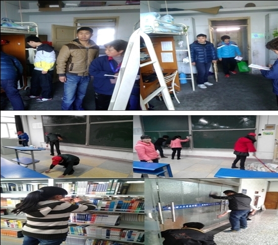 图书馆里,志愿者们在图书管理员的指导下,按要求把归还还未上架的图书整齐地放回原位,认真检查每个书架上有无顺序错乱的书;整理结束后,同学们又积极地打扫卫生,擦玻璃窗、书架、书柜等,经过耐心的整理和清扫之后图书馆焕然一新。
