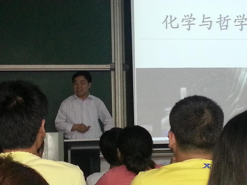 随后,他又引用了原北京大学校长、著名的高分子化学家周其凤作词的《化学是你,化学是我》这首“神曲”给同学们介绍了化学与日常生活的种种关系,引来同学们阵阵欢笑,同时引导同学们充分了解了化学的有用与有趣。在接下来的报告中,何杰教授分别就化学中的平衡哲学、量变与质变辩证关系、矛盾对立统一、矛盾普遍性与特殊性、内因与外因的相互关系等哲学话题展开阐述,结合生动、平易的案例,进一步解释了化学与世界、化学与生活的种种关联,引导同学们领略了常识中的化学之“用”与化学之“趣”。