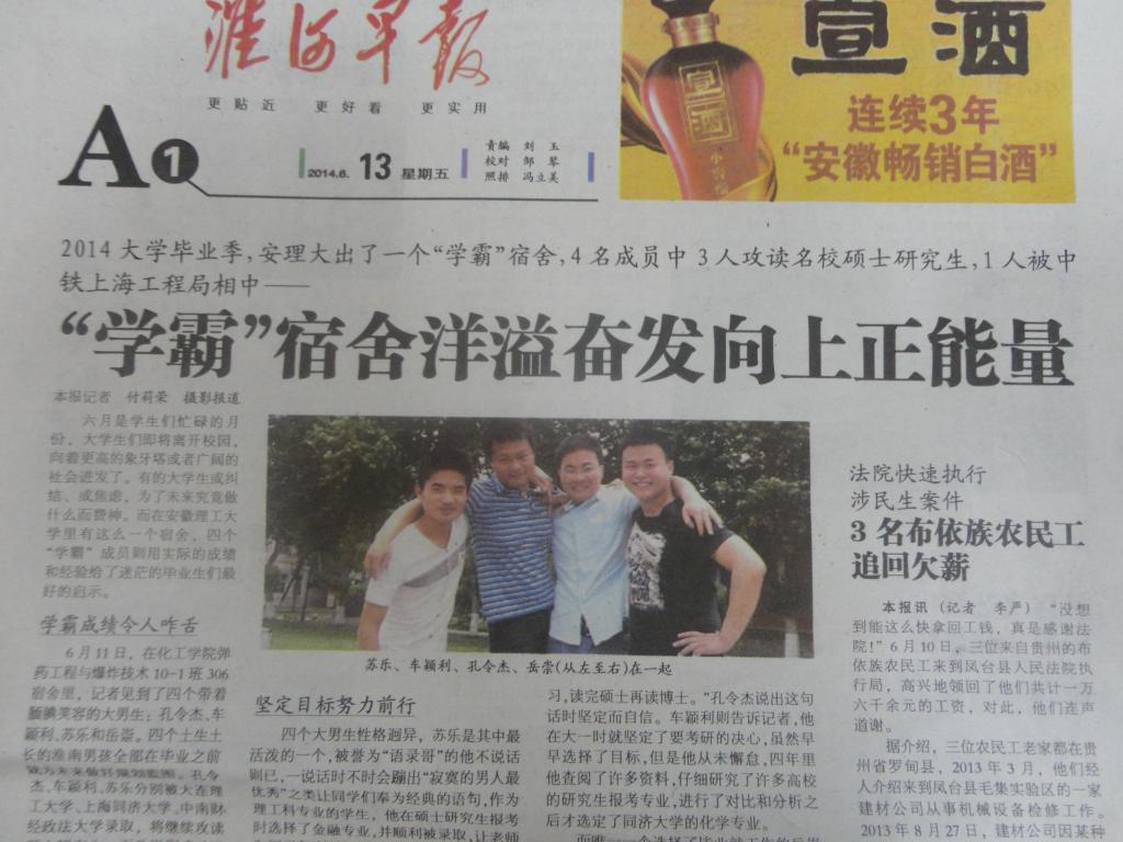 在化学工程学院有这样一个“学霸”宿舍,他们同住在高层公寓10306宿舍,4名成员中3人考上名校研究生,1人签约大型国企,他们的事迹一时引起社会的关注。6月13日,《淮河早报》在A1版头条详细报道了“学霸”宿舍“男神”们的奋斗历程,这个榜样宿舍用骄人的成绩为学弟学妹们留下了最好的经验和启示。