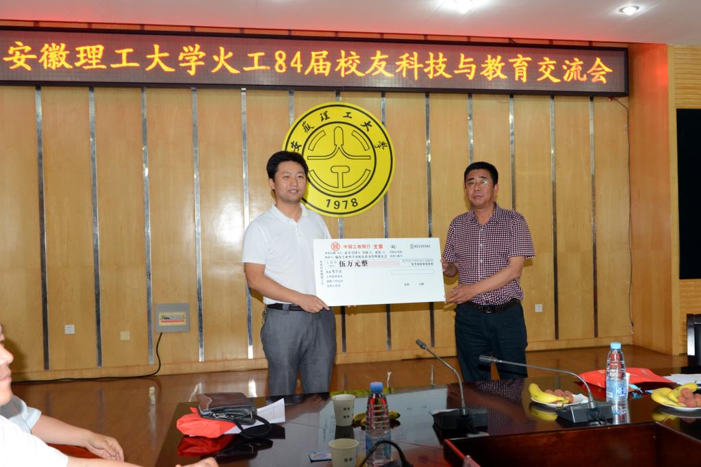 化工学院院长何杰代表全院师生对校友们回校考察、交流表示衷心欢迎,并介绍了学院的发展情况和取得的主要成就;代表全体师生对火工84届校友对学院的关心和支持表示真诚的谢意。校友代表、深圳金奥科技有限公司王明君代表全体校友发言,他用朴实的言语表达了本次聚会的激动心情,回顾了当年在学校成长、学习的经历及对母校的感恩之情。最后,校友们向母校捐赠了6万元助学教育资金。