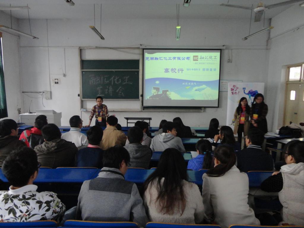 11月8日,芜湖融汇化工有限公司在结束了上午学校举行的秋季洽谈会后,下午在新附2102教室举行宣讲会。化学工程学院能化、化工及应化等专业同学参加宣讲。
