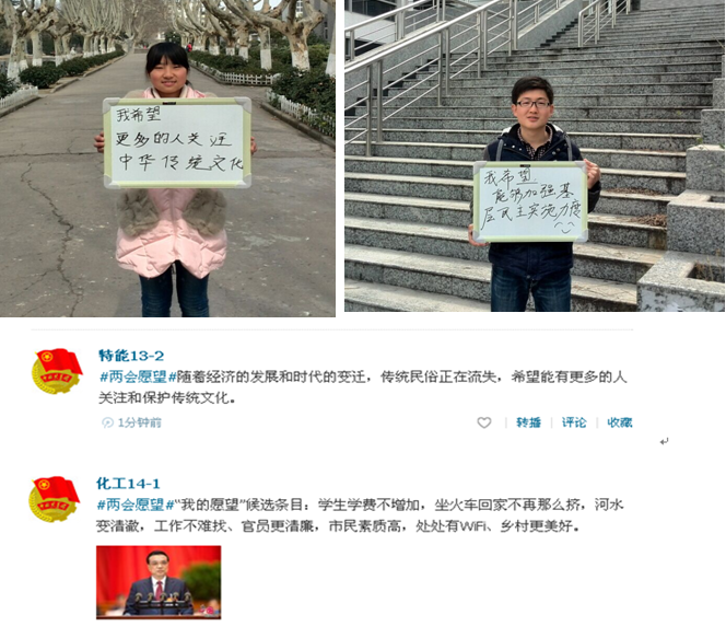 全国“两会”正在召开,化学工程学院学子以各种方式参与和学习“两会”,其中就业、创业、生态环境、传统文化、高等教育、基层民主建设等方面话题成为我院学子关注的重点和焦点。他们纷纷晒出愿望,表达对全国“两会”的关注和祝福。