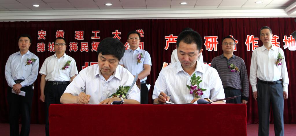 最后,何杰与龙海民爆有限公司董事长、总经理钟庆国分别代表校企双方签订产学研合作协议,并与昌乐县副县长姜俊刚共同为产学研合作基地揭牌。