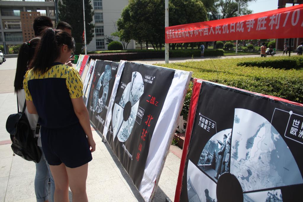 6月6日至7日,化学工程学院在北区喷泉广场举办“纪念世界反法西斯战争和中国人民抗日战争胜利七十周年”图片展,为广大同学上了一堂别开生面的历史教育课。院团委副书记杨志华和大学生一起观看了图片展,并在纪念条幅上签名。