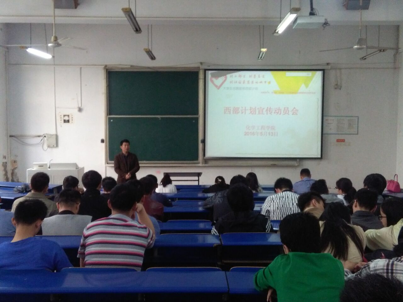 5月13日上午,化学工程学院在新附2102教室组织召开2016年大学生志愿服务西部计划动员宣讲会,宣传“西部计划”相关内容,引导和鼓励高校毕业生服务基层战略部署,到西部基层建功立业、成长成才。学院党委副书记徐泽绵、团委副书记杨志华、毕业班辅导员孙艳菊及60名同学参加了会议。