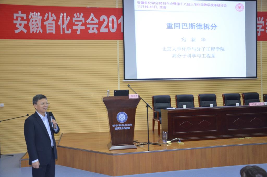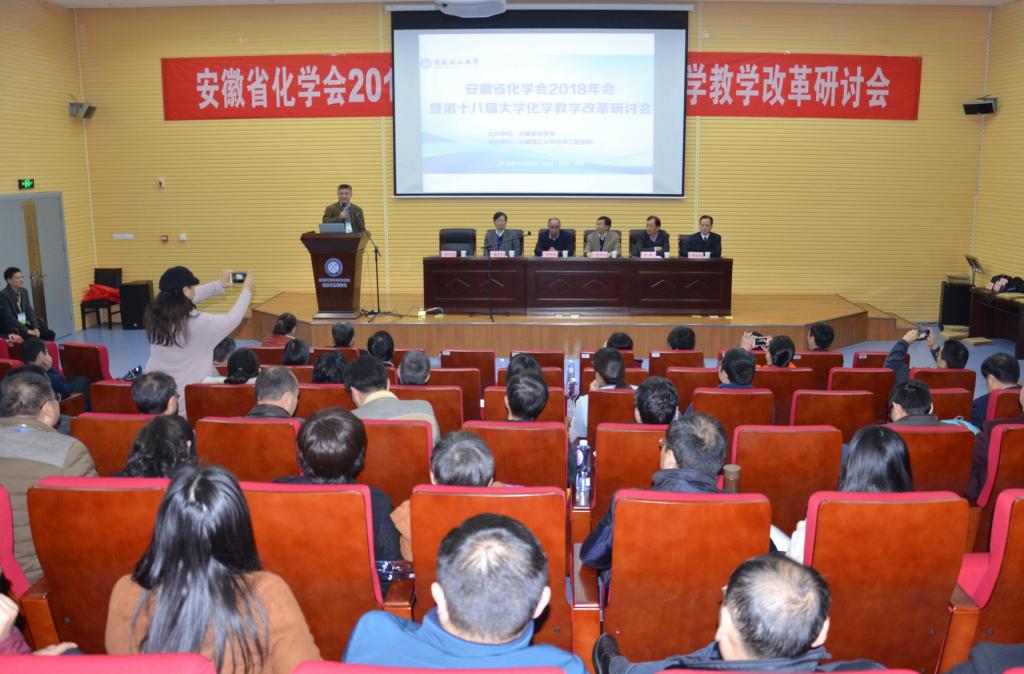 11月24日,安徽省化学会2018年会暨第十八届大学化学教学改革研讨会在我校举行,来自全省30余所高校化学化工相关专业教师及部分企业代表共200多人参会,大家围绕加强新时代化学化工本科教育教学工作及学科前沿问题展开研讨。会议由安徽省化学会主办,我校化学工程学院承办。副校长郑明东教授出席会议并致辞。