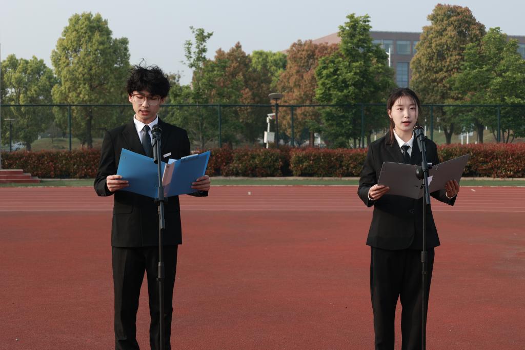 迎朝阳,沐清风。国旗护卫队的队员门步履铿锵、英姿飒爽,护送国旗入场,随着庄严的国歌声响起,鲜艳的五星红旗冉冉上升,全体师生肃立,向国旗行注目礼并齐唱国歌,用洪亮的歌声表达对党和国家的热爱之情。学生代表特能20-1班雷文昌发言,他号召同学们要继承和发扬崇高的爱国主义精神,将爱国内化于心,外化于行,从身边点滴小事做起,砥砺奋进。能化22-2班江文锐、化工22-2班门浩宇朗诵《我爱你中国》。