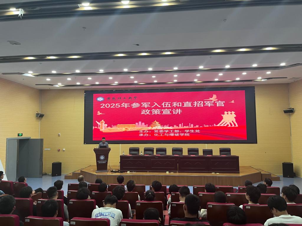 为响应新时代强军号召,4月28日下午,由党委学工部、学生处主办、化工与爆破学院承办的2025年参军入伍及直招军官政策宣讲会在我校举行。淮南市司法局副局长祝家光、宁波市北仑区交通局副局长赵恩辉、合肥市应急管理局执法监督处副处长何金龙等三位校友,以及2024届毕业生、武警海警某部少尉孙振威担任宣讲嘉宾,260余名学子现场聆听。