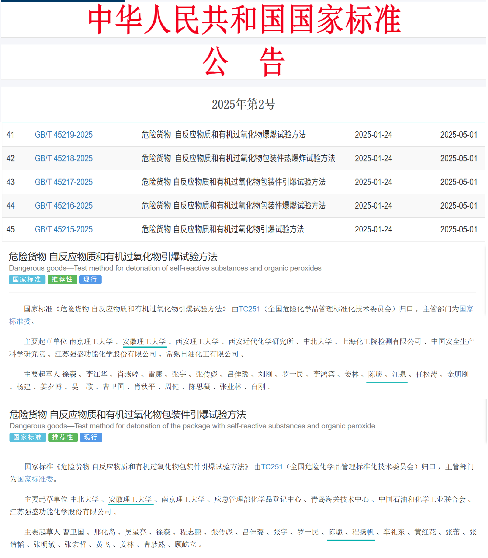 近期,我校作为第二、第三起草单位,由化工与爆破学院爆炸安全与防控技术团队陈愿高级工程师、汪泉教授和程扬帆教授等参与起草的《危险货物自反应物质和有机过氧化物引爆试验方法》等五项国家标准正式获批发布,并于2025年5月1日起实施。