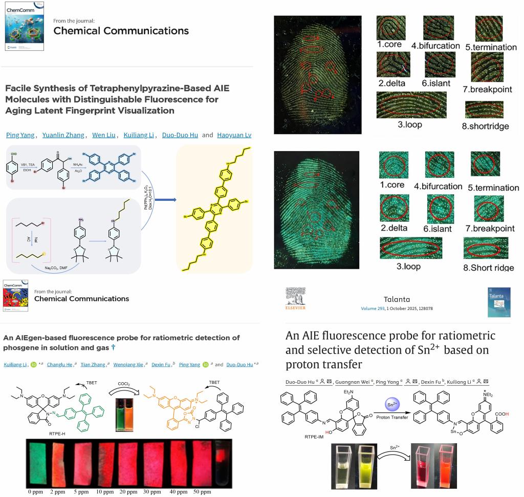 团队的核心研究方向为聚集诱导发光。该领域是材料科学、化学与生命科学交叉的前沿热点,在生物成像与诊疗、高灵敏度传感、光电材料等方面具有重要应用潜力。指纹因其终身不变性、人各不同的独特性,被视为个体身份的“生物身份证”,其显影技术在刑侦领域至关重要。杨萍教授团队以四苯基吡嗪为发光骨架,通过引入烷基链增强亲脂性,设计合成了一种新型有机荧光分子TPP-APBP-P。基于“相似相溶”原理,该分子可选择性富集于指纹脊线残留的皮脂(如甘油三酯、脂肪酸等)中,在不同基底、高温条件(长达9小时)下及对陈旧指纹(存放1个月)均能保持稳定的指纹显影性能(Chem. Comm., 2026, DOI:10.1039/D5CC05794A)。此外,面向环境安全监测需求,团队开发了系列高效荧光探针。比率型荧光探针RTPE-H基于螺环的开环特性及其与光气的亲核反应,实现了对光气的高选择性和高灵敏度检测(Chem. Commun., 2025, 61, 11041)。针对有害重金属离子Sn²⁺,探针RTPE-IM通过质子转移过程,表现出高选择性和低至0.121μM的检测限(Talanta, 2025, 293, 128078)。上述研究成果为环境健康监测与公共安全防护提供了有效的技术支撑。硕士研究生魏光楠、张远林和刘文等为上述工作做出了重要贡献。