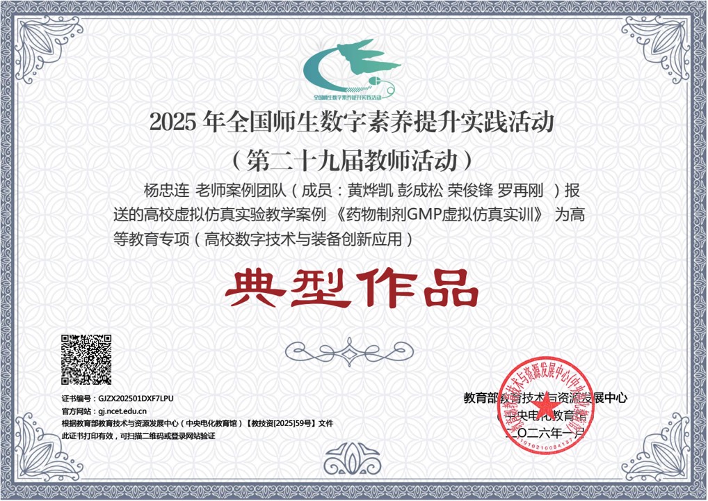 近日,由教育部教育技术与资源发展中心(中央电化教育馆)主办的“2025年全国师生数字素养提升实践活动(第二十九届教师活动)”评选结果揭晓。化工与爆破学院制药工程系杨忠连老师案例团队报送的《药物制剂GMP虚拟仿真实训》案例,经层层遴选,获评“典型作品”。该案例为本届活动中我校唯一入选的典型作品,标志着学院在数字化教学资源建设与智能化技术应用方面取得实质性进展,并获国家级认可。