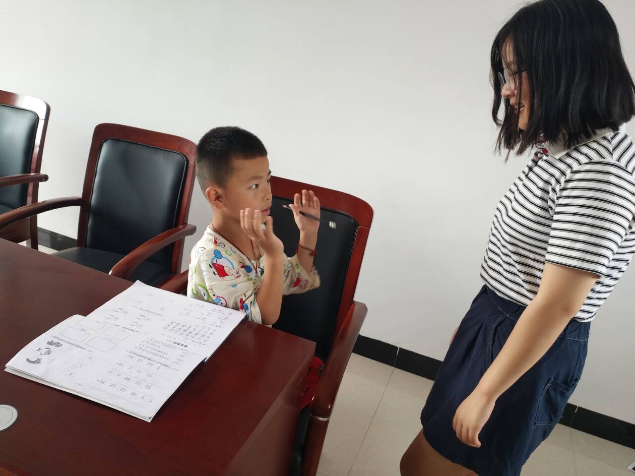 有人说“留守儿童是有父母的孤儿”,但他们乐观坚强,积极向上又很可爱。由于我支部在马场村持续开展过较长一段时间的支教活动,当地家长听闻前期宣传后就偕同孩子们来到我们的服务基地现场报名。在接下来的一周里,我支部成员耐心辅导孩子们完成暑期作业,带领他们观看爱国主义影片,并自己动手做一些简单的试验以科普生活及科学常识等。孩子们那一双双求知若渴的明眸,家长对孩子们殷切期望的心境,,使我们意识到了义务支教活动的意义所在,,明确了自己肩上的使命,也深刻地感受到了作为一名志愿者的骄傲与自豪。