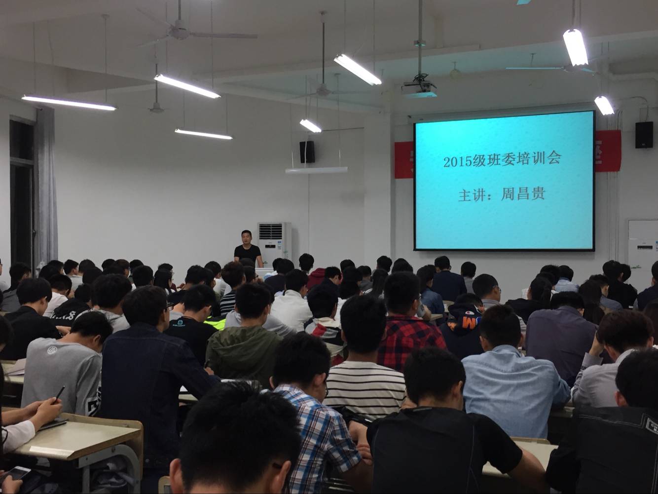 为贯彻落实新校区各项学生管理条例,确保各项管理细则落实到位,5月23日晚,化工学院在崇礼楼102教室召开学生骨干培训会。培训会由15级辅导员周昌贵老师主讲。15级各班班委、寝室长参加会议。