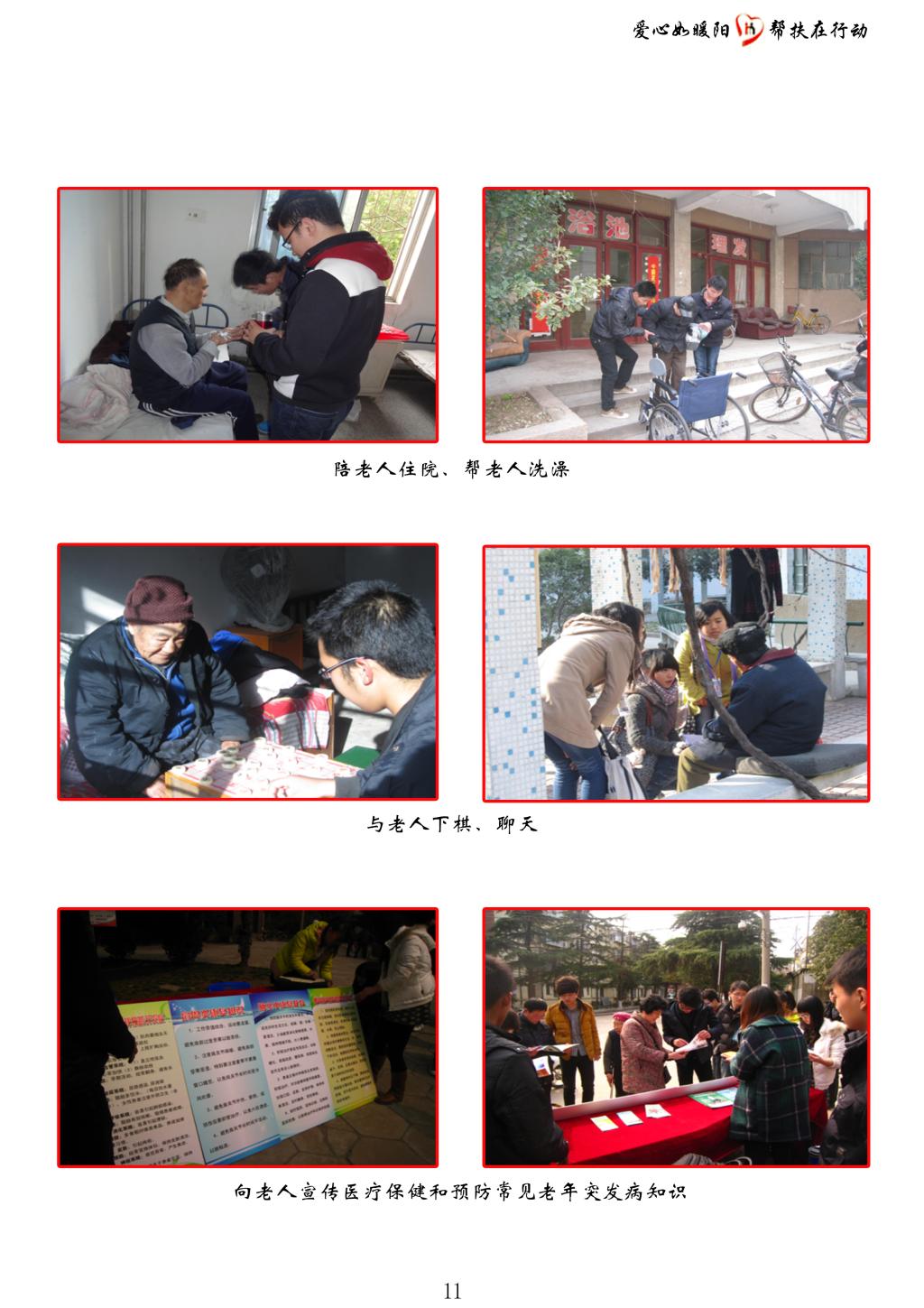 (二)丰富帮扶内涵,物质精神双扶。暖阳爱老学校充分利用帮扶团队成员的专业和工作优势,深化帮扶内容,从最初的帮扶老人打扫卫生、代购物品、陪同就医的生活照料;到提供看病咨询、健康知识讲座、义诊服务的医疗保健,再到利用雷锋月、青年节、教师节、重阳节等节假日进行慰问和慈善捐助;除此之外还依托学校社团活动,邀请老人观看、参与晚会进行文体娱乐和陪老人聊天交流、读书读报、心理疏导的精神关爱,从本质上帮助老人解决困难、丰富生活、陶冶情操、促进健康。