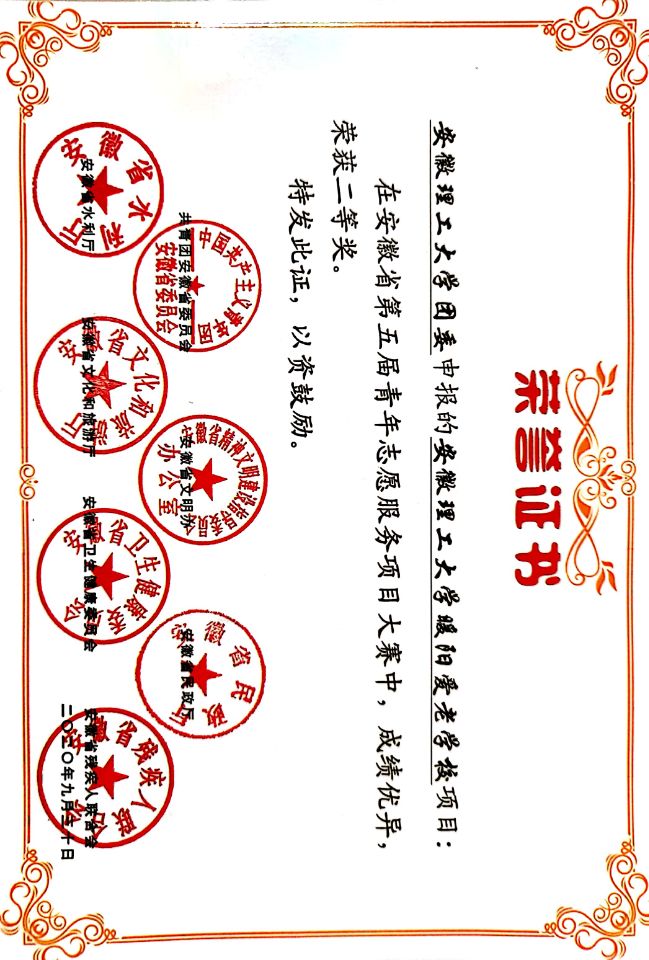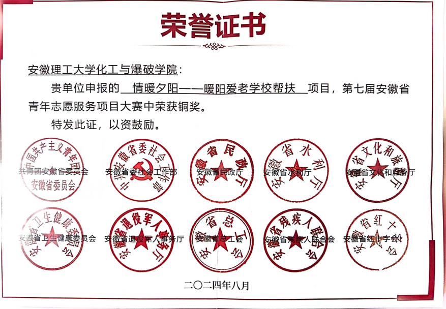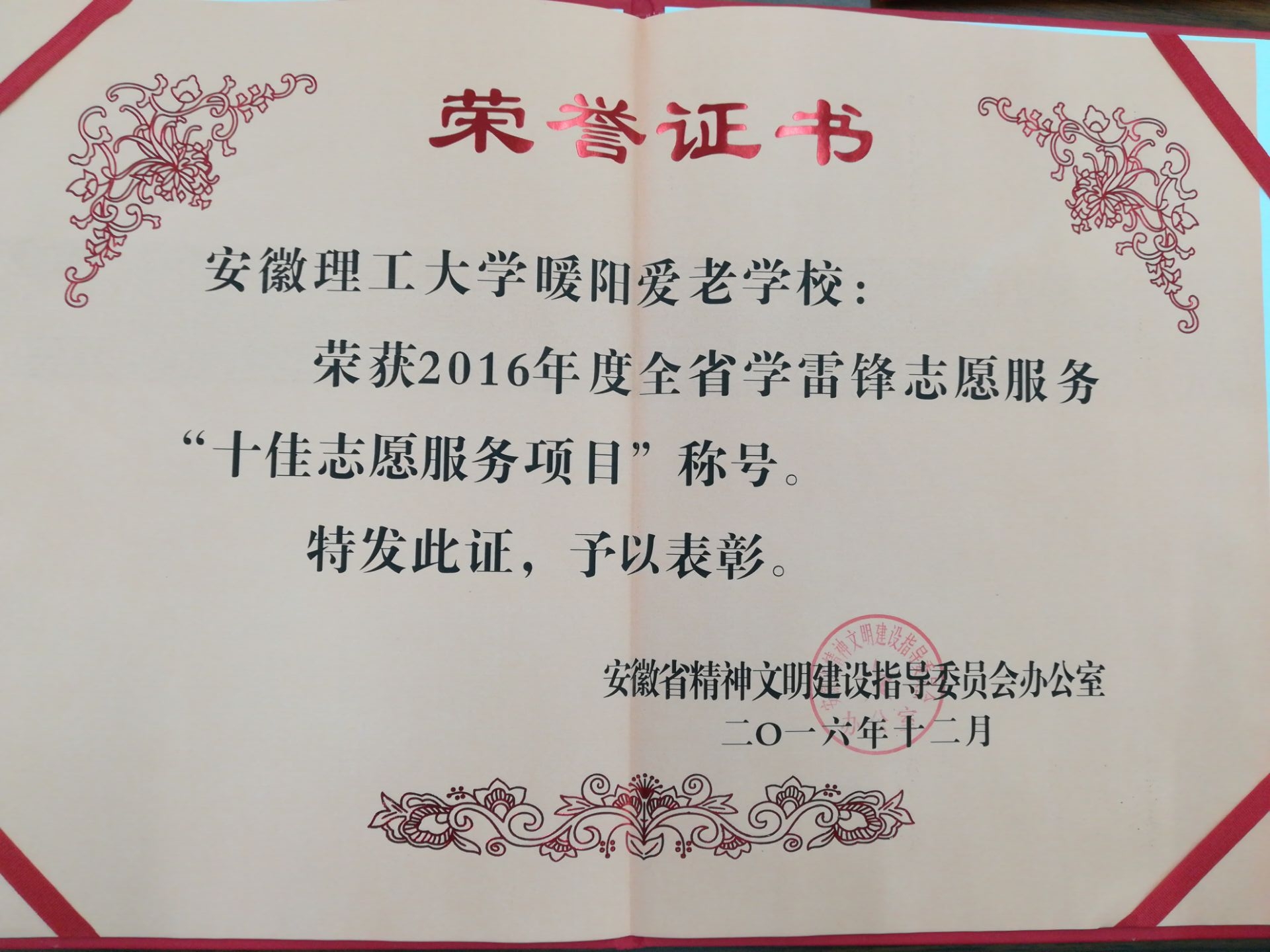 (二)社会影响广泛。暖阳爱老学校成员开展宣传教育20余场,受邀介绍经验10余次。该组织先后获全国10件“身边的榜样——大学生道德实践优秀成果”(2014年)、淮南市志愿服务十佳项目(2015年)、安徽省“十佳学雷锋志愿服务”项目典型(2016年)、第二届“中国创翼”青年创业创新大赛“创翼之星”(2016年)、安徽省大学生公益创新创业案例征集项目唯一一等奖(2017年)、安徽省“创青春”公益实践类创业大赛银奖(2018年)、安徽省青年公益项目大赛银奖(2020年)、安徽省第七届青年志愿服务项目大赛铜奖(2024年)、入选全国共青团为老志愿服务项目展示案例(2024年,为全省唯一入选高校)等集体荣誉。2014年-2024年间,《光明日报》《安徽日报》《安徽青年报》、安徽电视台、人民网等媒体转载报道500余次。