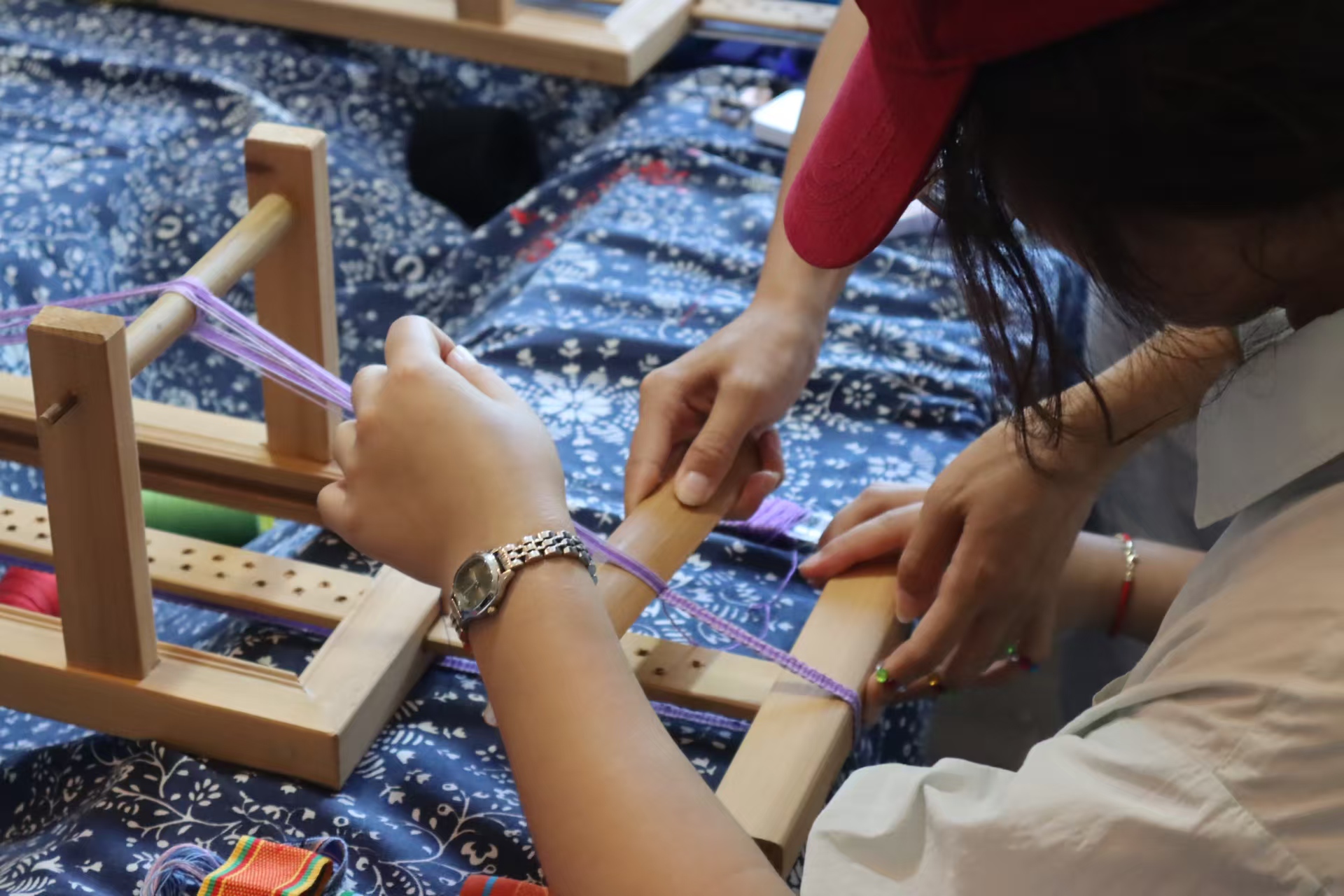 蓝老师指导团队成员编织彩带(拍摄:葛亚婷)