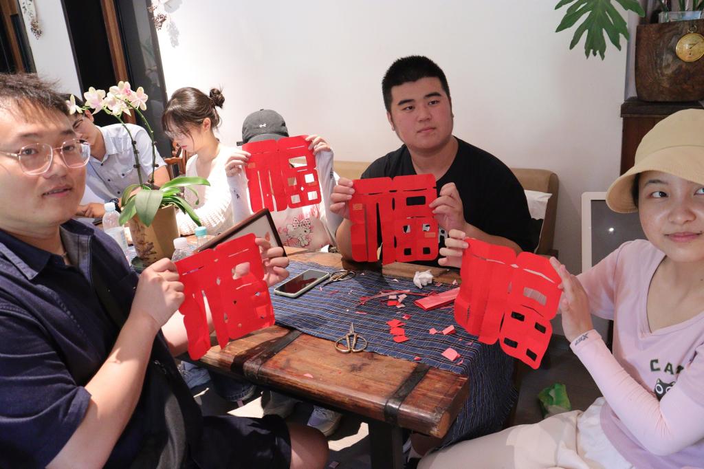 随后,队员们先后来到圩壹森境和沈福壹号,体验了非洲鼓、剪纸、扎染及蓝染等活动。荞麦老师展示了各式剪纸作品,并向大家介绍“有图必有意,有意必吉祥”的剪纸文化;在她的指导下,队员们亲手完成了“福”字剪纸。她还寄语青年,希望大家能认识、了解并爱上剪纸这门传统技艺。徐云帆老师则手把手教学蓝染与扎染,让队员们在动手实践中沉浸式感受传统文化的魅力。