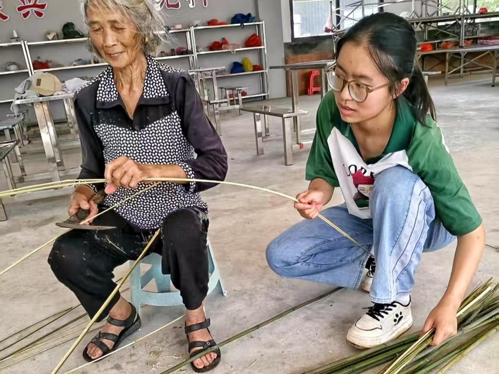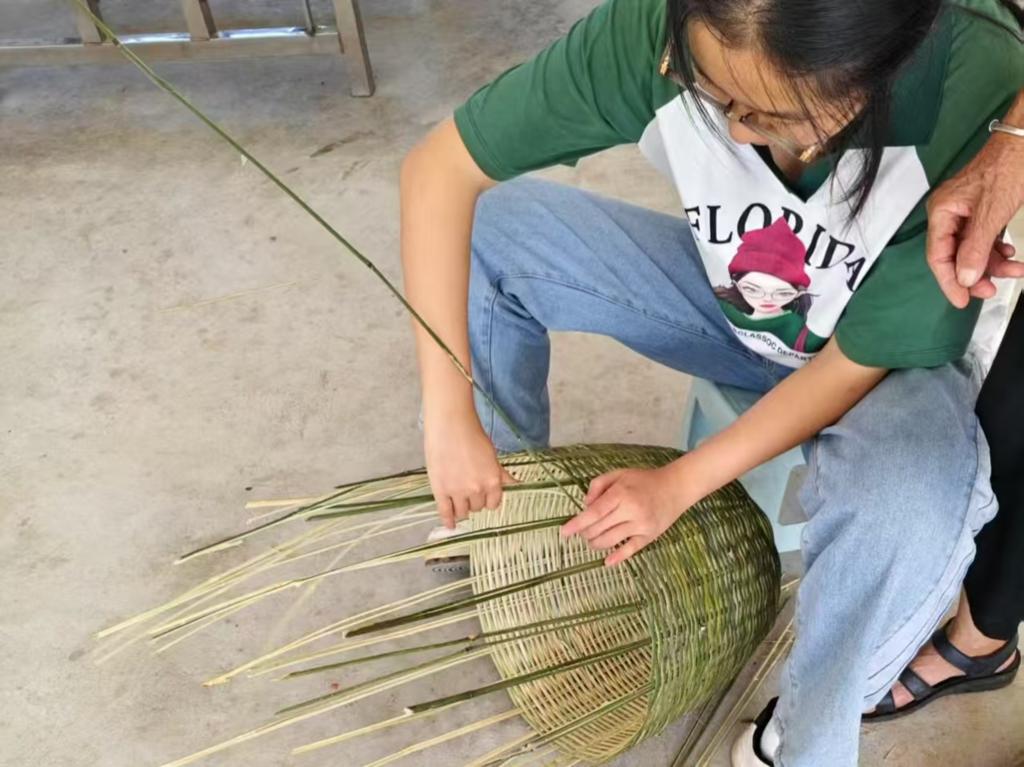 8月2日清晨,队员们随老手艺人老奶奶学选材,“竹节要匀,竹身要直”,朴实话语藏着祖辈经验。队员们体验伐竹、破篾,锋利篾刀将竹竿剖成细如发丝的竹篾,指尖的刺痛让大家懂了“百炼钢化为绕指柔”的深意。