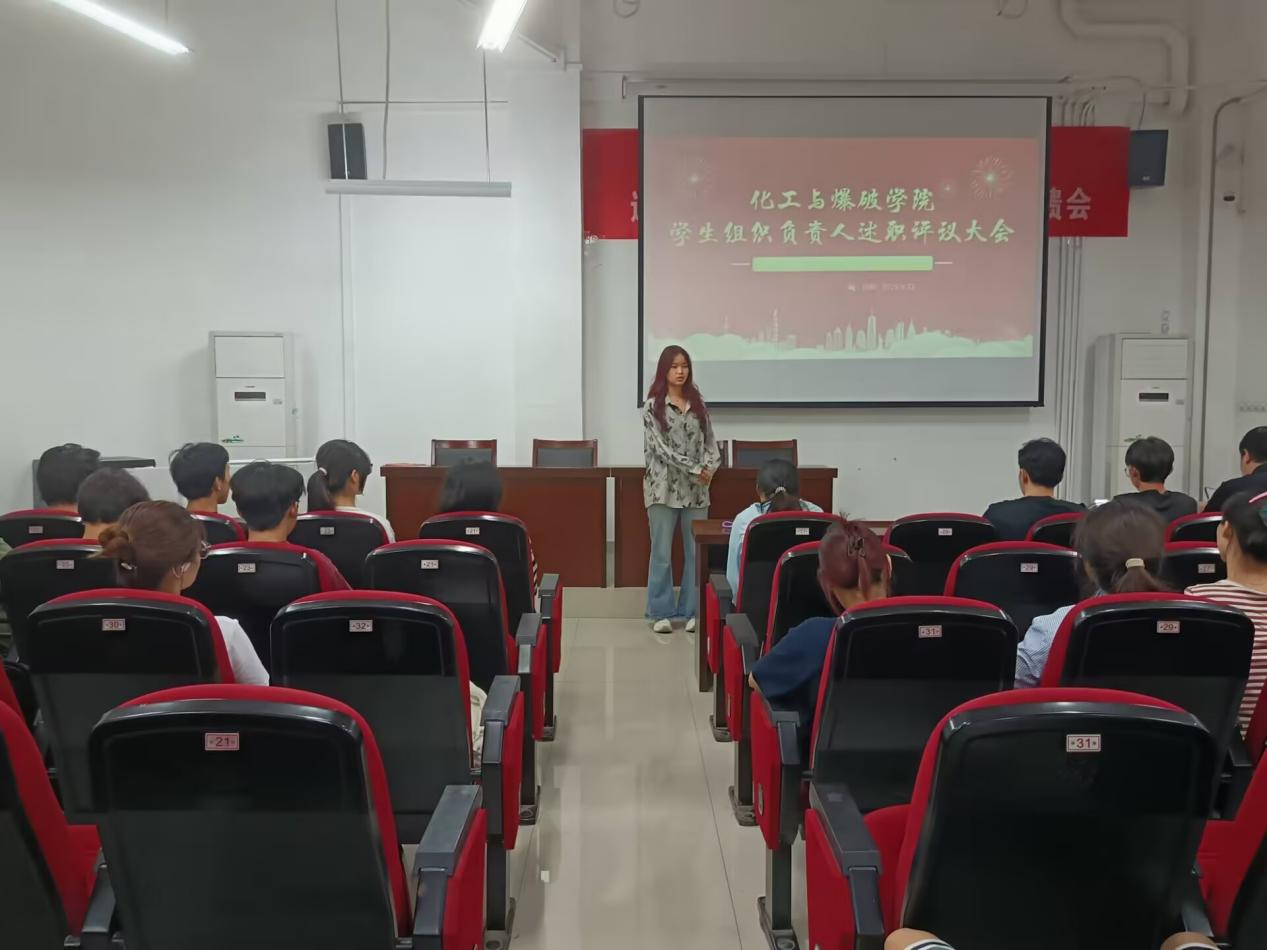 9月22日晚,化工与爆破学院学生会组织各部门全体成员在崇礼楼102会议室举办述职评议大会,围绕工作成果总结和组织招新展开讨论。