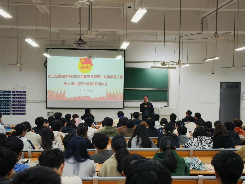 11月6日晚,化工与爆破学院在天工105举办2025年青年马克思主义培养工程暨大学生骨干培训班开班仪式,学院党委副书记曹秀军、团委相关负责人以及150余名学生骨干参加开班仪式。