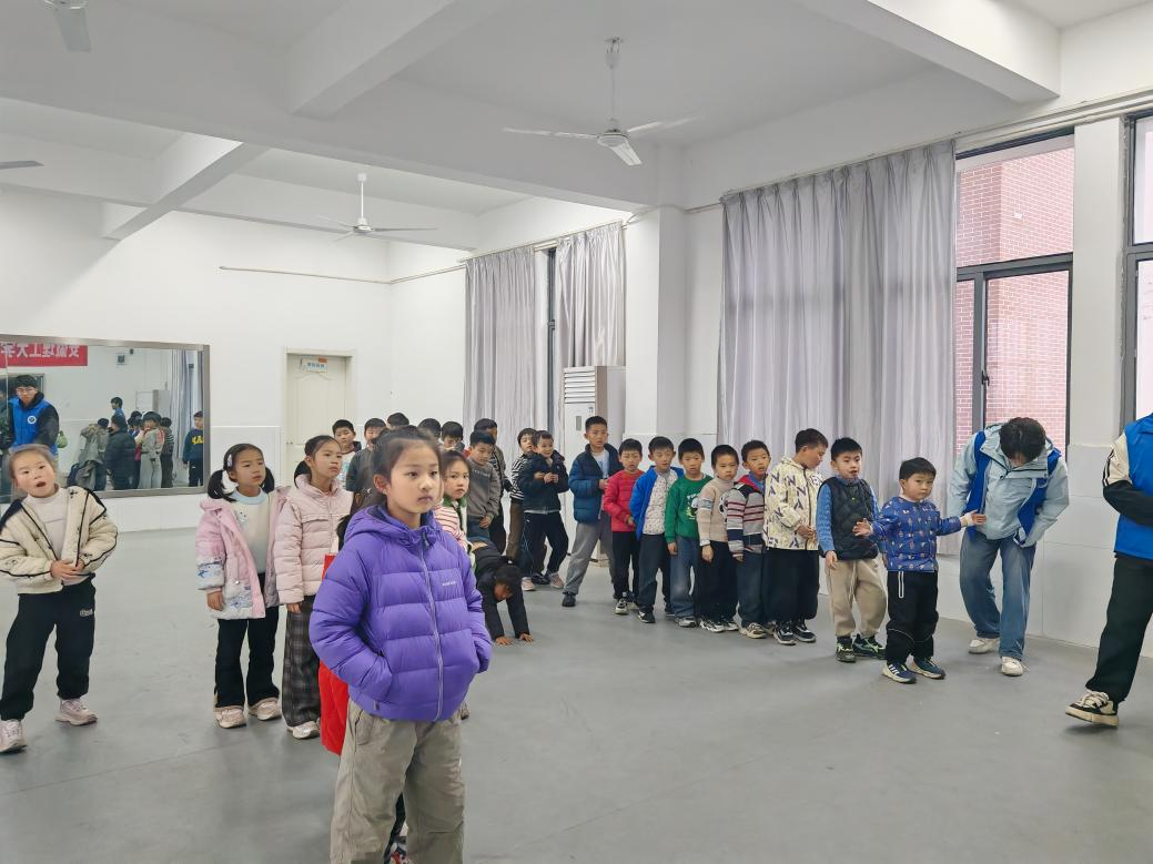 趣味运动环节中,志愿者以足球为载体,设计 “楚河传球”“项羽射门” 等特色活动,将楚淮元素巧妙融入足球运动,引导孩子们在接力传接、射门竞技中体会团结的力量,在楚辞接龙、编钟造型传球中加深对本土文化的认知。志愿者全程耐心指导,重点关注内向学生,鼓励每一位孩子大胆参与,确保全员都能融入活动、收获快乐。