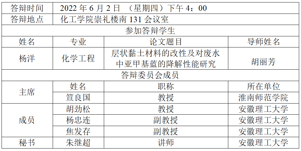 安徽理工大学化学工程学院硕士研究生学位论文答辩公告(六)