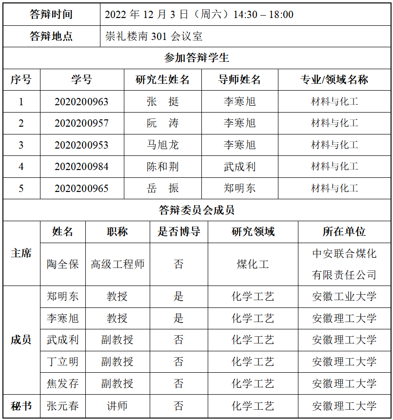 安徽理工大学化学工程学院硕士研究生学位论文答辩公告(三)