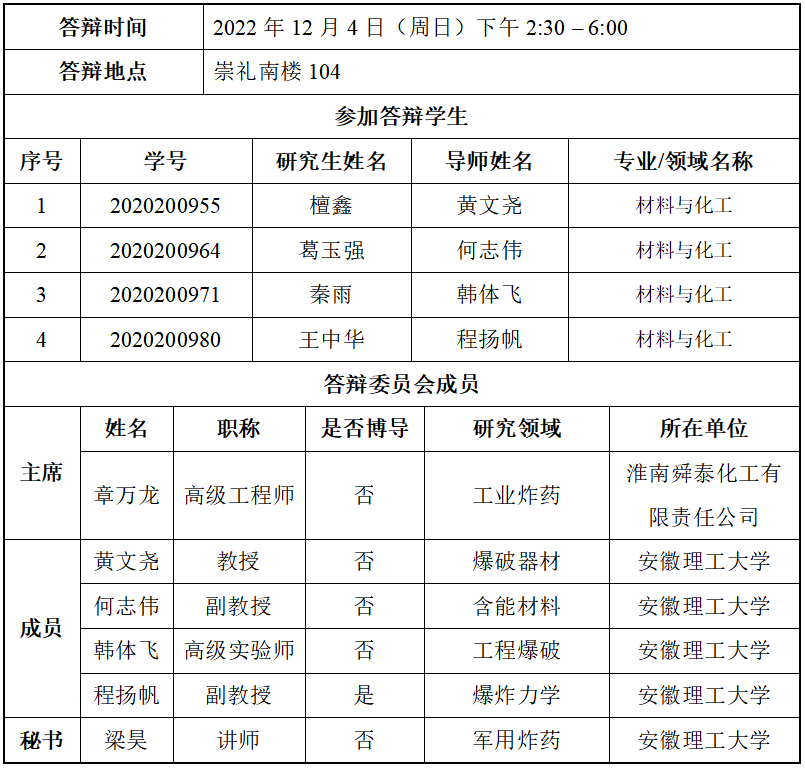 安徽理工大学化学工程学院硕士研究生学位论文答辩公告(四)