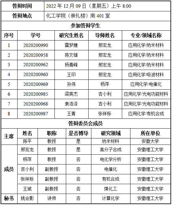 安徽理工大学化学工程学院硕士研究生学位论文答辩公告(七)